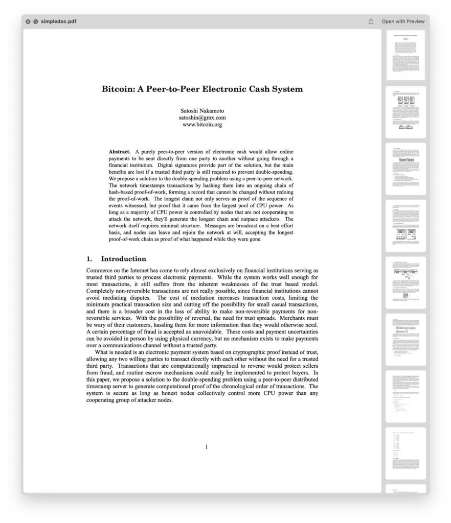 Każdy system operacyjny macOS firmy Apple wyprodukowany po 2017 r. zawiera oryginalny manifest pt „Bitcoin: A Peer-to-Peer Electronic Cash System” autorstwa Satoshiego Nakamoto. Odkrycia dokonał wczoraj deweloper Andy Baio. Whitepaper Bitcoina, bo tak inaczej nazywa się wspomniany manifest, opisuje sposób wydobywania i operowania pierwszą kryptowalutą opartą na blockchainie.