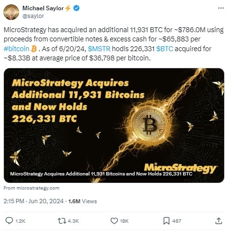 Źródło: https://x.com/saylor/status/1803763490928119950Jak wynika z czwartkowego porannego komunikatu prasowego, notowana na giełdzie Nasdaq firma programistyczna MicroStrategy (MSTR), największy korporacyjny właściciel bitcoinów (BTC), nabyła kolejne 11 931 BTC za 786 milionów dolarów.