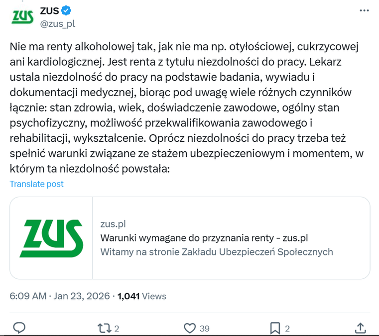 Taki przekaz wprowadza odbiorców w błąd. ZUS odniósł się do krążących w sieci informacji i wyjaśnił, na jakich zasadach przyznawana jest renta z tytułu niezdolności do pracy. Sam fakt uzależnienia nie stanowi podstawy do otrzymania świadczenia.