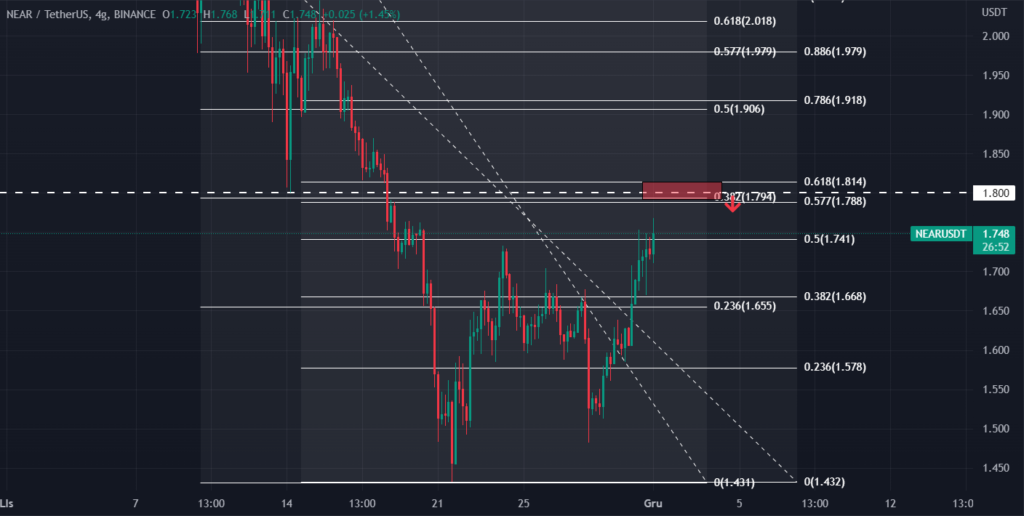 NEAR na wykresie 4-godzinnym dociera powoli do poziomu 1.800$, który stanowi opór na ten moment i w tym miejscu można spodziewać się reakcji podażowej. Jest to poziom testowany w 2021 roku jako wsparcie przed wystrzałem w stronę ATH, które zostało ustanowione na wartości 20$.