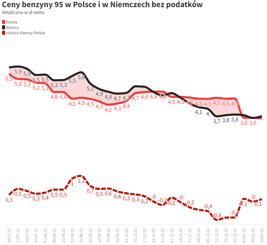 Według analizy portalu „Business Insider” opartych na danych Komisji Europejskiej, utrzymywanie za wysokich cen miało miejsce przynajmniej od połowy listopada ubiegłego roku. 14 listopada ub.r. cena diesla na polskich stacjach bez podatków była bowiem po raz pierwszy od czerwca 2020 r. wyższa niż cena netto w Niemczech.