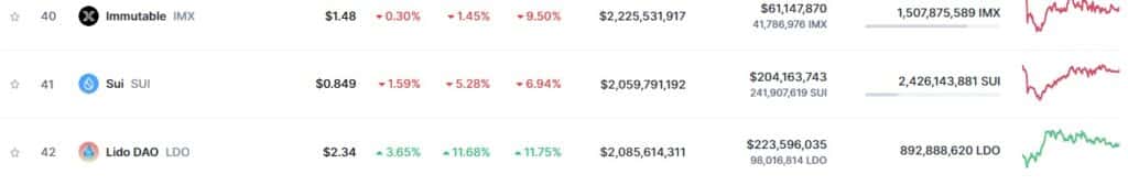 O ile LEO to kryptowaluta, która zachowuje zaskakującą stabilność w ostatnim kryzysie, to Lido jest niczym zielona wyspa. Zdecydowana większość kryptowalut krwawi, a wyniki Lido mienią się na zielono. W poniedziałek dane z CoinMarketCup wskazywał, iż w ciągu 24 godz. DAO zyskał na wartości 14,43%. Z kolei w ujęciu tygodniowym token zyskał 16,13%.