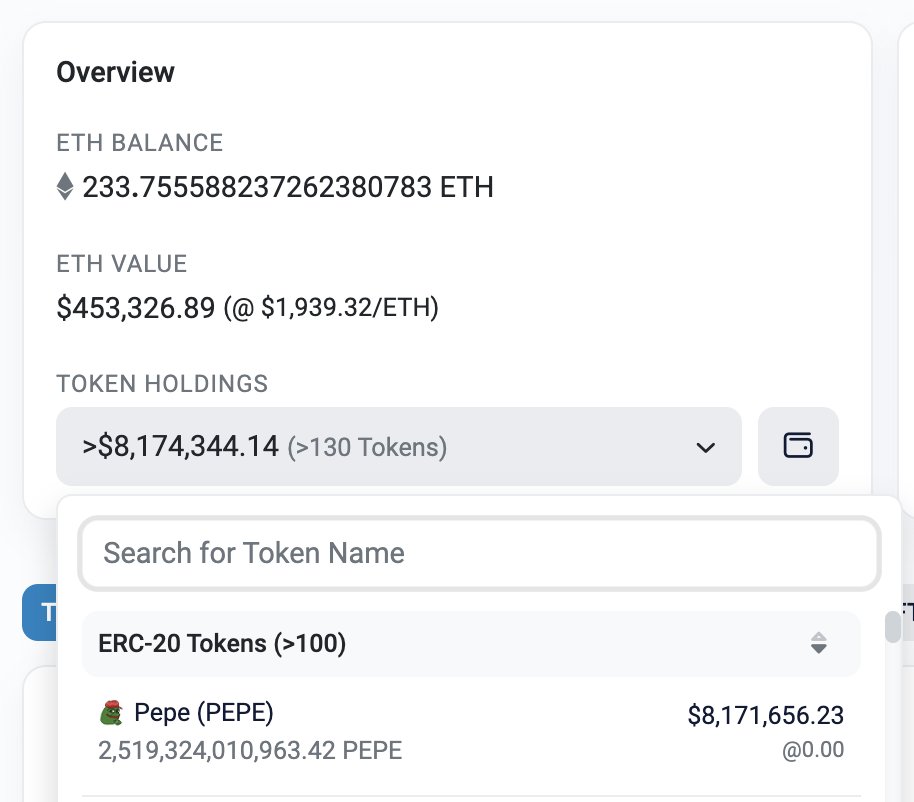 Wspomnieliśmy w ostatnim artykule o portfelu należącym do dewelopera w którym znajdują się tokeny PEPE zakupione za …25 dolarów. Wtedy były warte 4,2 mln USD. Teraz to już ponad 8 mln zielonych. Co ciekawe, portfel jest na czarnej liście (kontrakt pozwala na taką funkcję, nie da też się jej aktualnie zdjąć). Posiadanych tokenów nie można więc na nic zamienić.