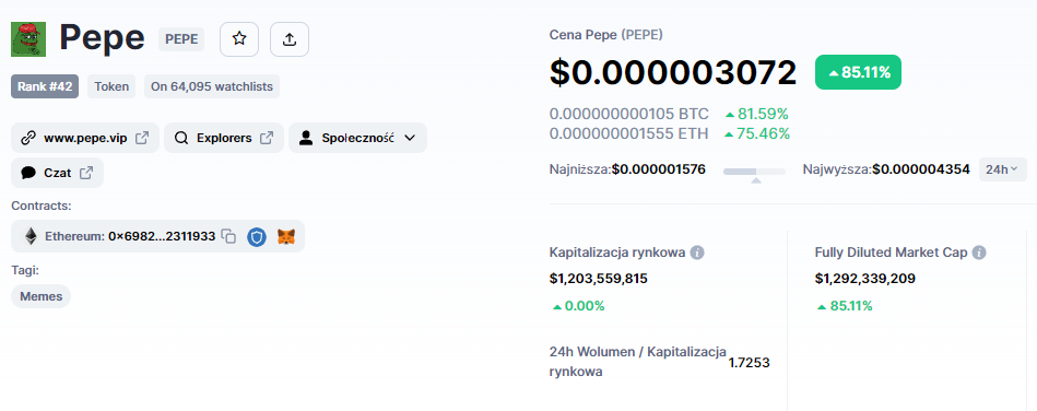 Źródło: CMCNa maksimach token sygnowany słynną internetową żabką posiadał całkowitą kapitalizację rzędu 1,6-1,7 miliarda dolarów, a prawdziwa gorączka złota zaczęła się ok. godziny trzynastej czasu polskiego. Momentum trwało jeszcze do wczesnych godzin wieczornych, w tej chwili trwa etap realizowania zysków. Na chwilę powstawania tego tekstu kapitalizacja PEPE wynosi 1,2 mld USD.