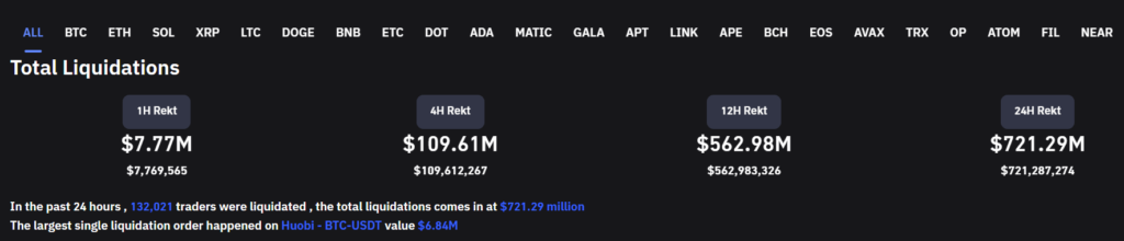 Całkowita wartość likwidacji przekroczyła 721 mln USD. Źródło: Coinglass