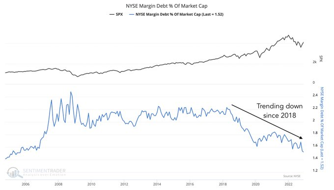 Źródło: Game of TradesDług marżowy NYSE jako % kapitalizacji rynkowej ma tendencję spadkową od 2018 r. W rzeczywistości ryzyko masowego margin call ( wezwania do uzupełnienia depozytu zabezpieczającego) jest w tej chwili niższe niż w latach 2007 – 2018.
