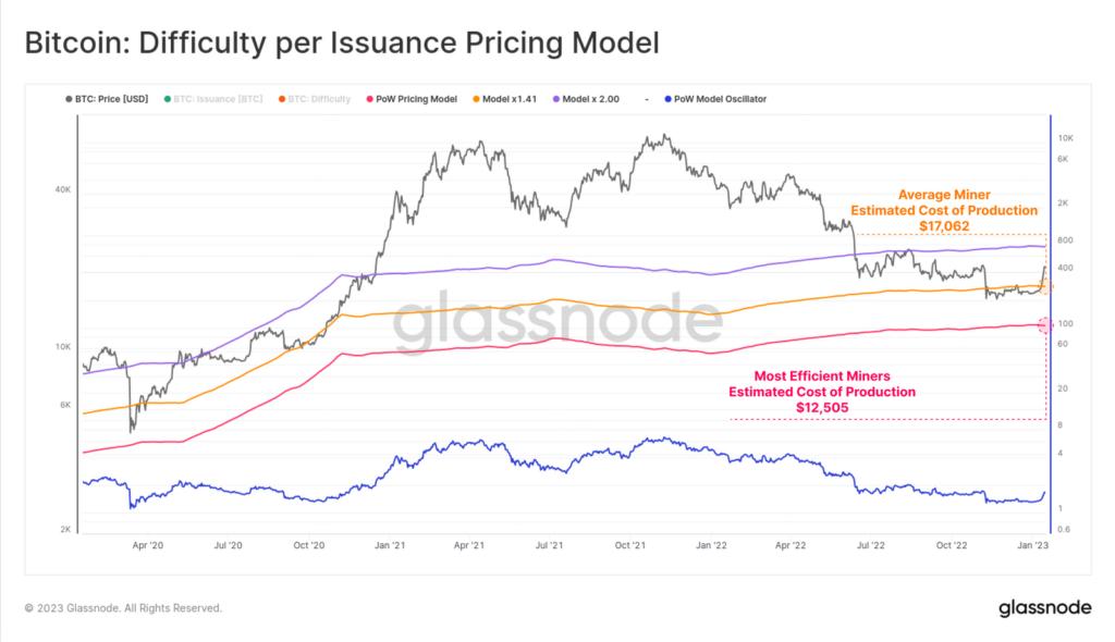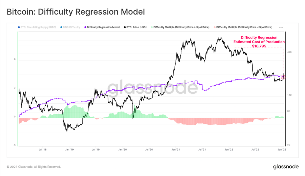 W ciągu ostatnich 12 miesięcy jednym z najbardziej dotkniętych sektorów były oczywiście firmy wydobywające Bitcoiny. Było to szczególnie widoczne w tym cyklu, ponieważ spółki giełdowe doświadczyły olbrzymich spadkó wycen ich akcji. Mow m.in. o Argo Blockchain, HIVE Blockchain, BitDigital czy Riot Blockchain. Model szacuje średni obecny koszt produkcji BTC na 18 798 USD, przy założeniu, iż trudność odzwierciedla ostateczną „cenę” sektora górniczego – jak wiemy na tą ostatecznie wpływa wiele zewnętrznych czynników.