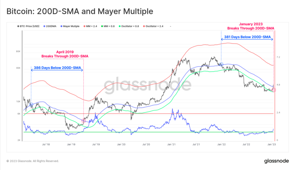 Źródło: GlassnodeDwustusesyjna średnia SMA 200 jest jednym z najczęściej używanych narzędzi analizy technicznej we wszystkich klasach aktywów, często znajdując zastosowanie jako wyznacznik makro trendów rynkowych. Przez lata BTC pokazał, iż gdy cena jest nad SMA 200 byki posiadają rzeczywistą przewagę i odwrotnie. Wraz z olbrzymim rajdem z ostatniego tygodnia, rynek pokonał ten psychologiczny poziom przy 19 500 USD. Poniżej 200 SMA BTC znajdował sięprzez 381 dni, tylko o 5 dni mniej od bessy z 2018-19 gdy poniżej SMA 200 cena znajdowała się przez 386 dni. Potencjalny powrót w okolice 19 500 USD może okazać kluczowym testem siły dalszej rajdu w ciągu najbliższych dni, a średnia SMA 200 pozostaje bardzo istotnym wsparciem, które zostało pokonane.