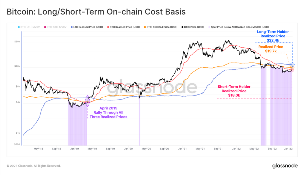 Zarówno na rynkach niedźwiedzia w latach 2018-19, jak i 2022-23 wszystkie trzy zrealizowane ceny zbiegły się, wskazując na powrót do jednakowej bazy cenowej inwestorów (gdzie przeciętny właściciel Bitcoina nosi w przybliżeniu równoważną podstawę kosztową, niezależnie od czasu posiadania). Krótkoterminowa cena zrealizowana przez średniego posiadacza STH jest atrakcyjniejsza od pozostałych, odzwierciedlając duże wydarzenie (upadek FTX), po którym wiele BTC zmieniło właścicieli. Wzrost ceny powyżej 22,4 tys. dolarów oznaczałby skok powyżej LTH-Realized Price, dzięki czemu średnio posiadacze we wszystkich grupach wróciliby do zysku, co dodatkowo mogłoby ograniczyć ich skłonność do sprzedaży i pomóc popytowi (funkcja podaż-popyt).