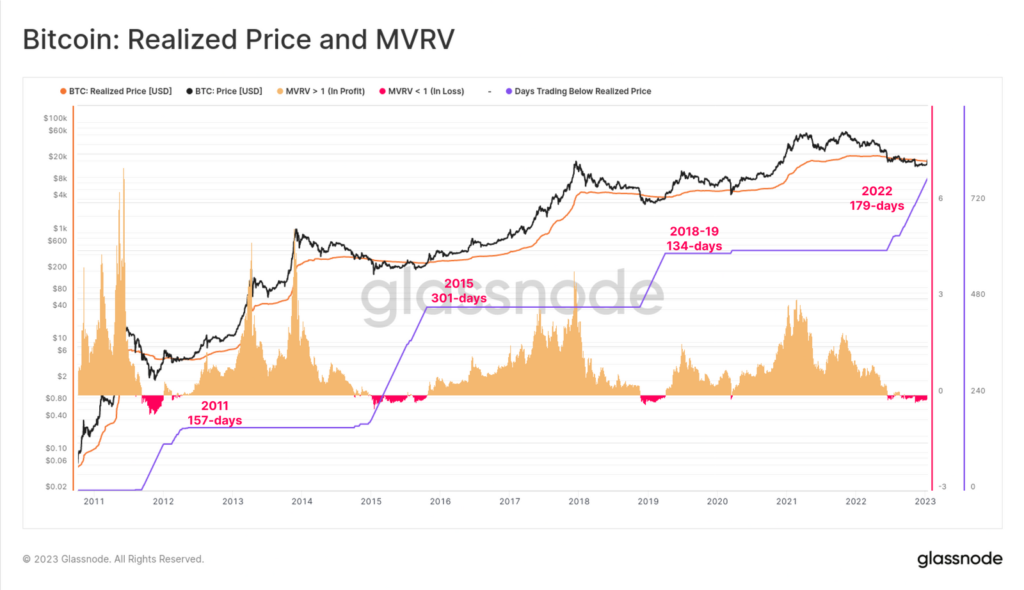 Źródło: GlassnodeŚrednia cena BTC nabytych w łańcuchu bloków tzw. Realized Price wynosi w tej chwili 19,7 tys USD co wskazuje, iż przeciętny właściciel BTC z powrotem znalazł się w niezrealizowanym zysku netto. Do tej pory rynek niedźwiedzia 2022-23 spędził łącznie 179 dni poniżej ceny zrealizowanej, co czyni go drugim najdłuższym czasem trwania w ciągu ostatnich czterech cykli bessy. Cena zrealizowana na poziomach zbieżnych z wyżej opisaną SMA 200 czyni te poziomy tym bardziej istotnymi w krótkim i średnim terminie, a spadek poniżej nich może zwiastować, iż więcej bólu dla byków jest w drodze.