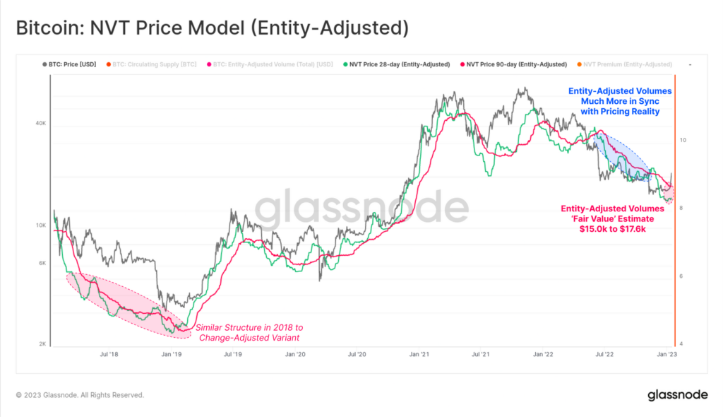 Źródło: GlassnodeModel ten wykorzystuje spojrzenie wstecz na ostatnie dwa lata wolumenu BTC, a następnie wyprowadza szacunkową „implikowaną wartość godziwą” w oparciu o przepustowość wartości sieci BTC. Zastosowany powyżej przez Glassnode wolumen Change-Adjusted filtruje transfery przy użyciu standardowych metryk branżowych. Model pokazał dwie godne uwagi wydarzenia w ciągu ostatnich 12 miesięcy. Model znacznie przeszacował wartość godziwą Bitcoina w 2022 roku. Z perspektywy czasu jest to prawdopodobnie wynik wolumenu pochodzącego od dużych podmiotów przechodzących masowe wydarzenia związane z delewarowaniem, ale także z niefortunnym komponentem (błędnego) zarządzania portfelem przez podmioty FTX/Alameda w sądnych dniach ich działalności. Model załamał się wraz z ogromnym zmniejszeniem wolumenu transferów w zeszłym tygodniu, sugerując wartość godziwą BTC pomiędzy 8200 USD a 10 000 USD za Bitcoina. Nie jest jasne czy metryki te ulegną długotrwałej poprawie.