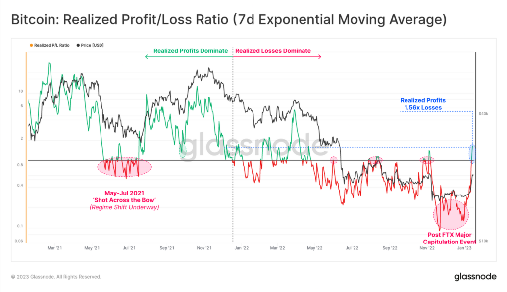 Ostatnim interesującym nas wszystkich tematem jest oczywiście powrót zyskownych transakcji on-chain. Model aSOPR jest w trakcie re-testu wartości 1,0 od dołu. Poziom ten okazał się kluczowym poziomem oporu podczas całego rynku niedźwiedzia. Wybicie aSOPR powyżej, a w najlepszym wypadku udany re-test 1,0 często sygnalizował znaczącą zmianę klimatu rynkowego ponieważ zyski są realizowane, a nowy popyt jest wówczas wystarczająco duży, aby je wchłonąć.