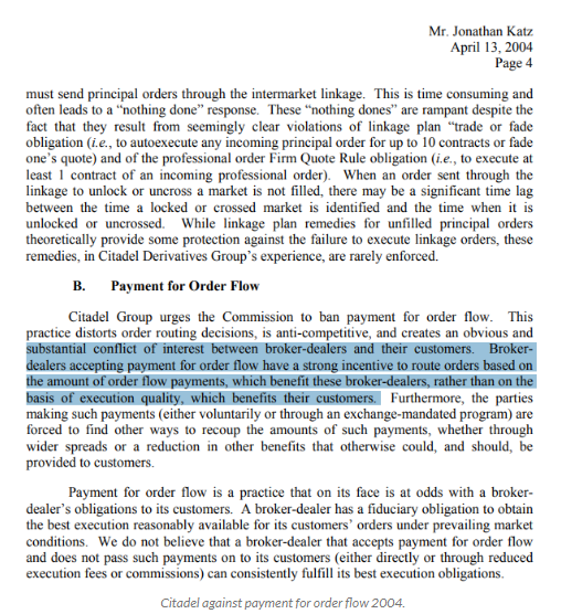 Skoro już jestemy przy egzekucji zleceń, Robinhood zasłynął jako dostawca zleceń klientów do animatora rynku. Czyli kogo? Oczywiście do Citadel Securities. w uproszczeniu – obie instytucje zarabiały na tym, iż ich klienci otrzymywali mniej atrakcyjne ceny realizacji zleceń na rynku akcji… Jeszcze w 2004 roku, Citadel chciał zakazu modelu PFOF (płatność za przepływ zleceń), uwaga: „Citadel Group wzywa Komisję do wprowadzenia zakazu płacenia za przepływ zleceń. Ta Praktyka ta zniekształca decyzje dotyczące kierowania zleceń, jest antykonkurencyjna i tworzy oczywisty i istotny konflikt interesów między brokerami-dealerami a ich klientami.” Czy to nie ironiczne?