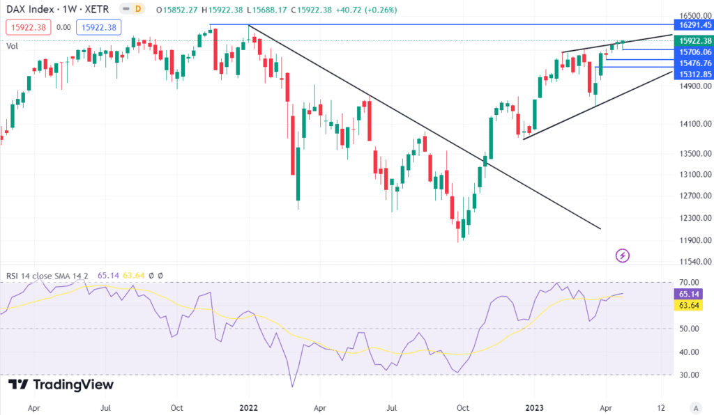 DAX z każdą kolejną sesją stara się “wyszarpać” kolejne maksima. Od dwóch tygodni idzie to bardzo wolno. Niewątpliwym sukcesem jest przebicie przez niemiecki indeks maksimów z lutego i marca 2023 roku.
