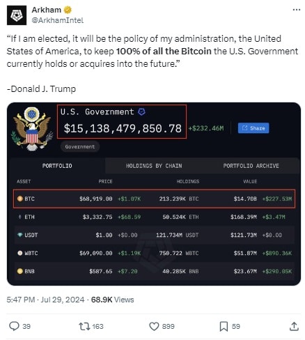 O tym, iż USA włączą BTC do rezerw finansowych, rynek spekulował od kilku tygodni. Kilka dni temu Donald Trump, w trakcie konferencji Bitcoin 2024 w Nashville, potwierdził te pogłoski i zapowiedział, iż USA pod jego rządami stworzą krajową rezerwę Bitcoina. Ponadto zadeklarował, iż utworzy specjalną radę doradczą ds. kryptografii.