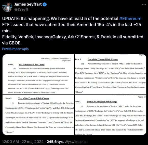 James Seyffart, analityk Bloomberga, ogłosił na platformie X, iż proces zatwierdzania spotowych funduszy Ethereum ETF w USA jest na ostatniej prostej. Znany ekspert poinformował, iż co najmniej pięciu potencjalnych emitentów złożyło swoje zaktualizowane formularze 19b-4 w ciągu zaledwie 25 minut.