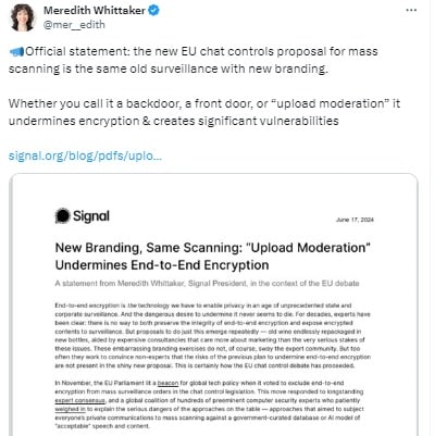 Meredith Whittaker, prezes firmy odpowiedzialnej za komunikator Signal, wydała stanowczy komunikat w tej sprawie. Whittaker zapowiedziała, iż jeżeli UE wprowadzi zakaz szyfrowania E2EE, to Signal może wycofać się z rynku europejskiego w trosce o prywatność swoich użytkowników. W poście na X Whittaker napisała: „Nowa propozycja UE dotycząca kontroli czatów odnośnie masowego skanowania to ten sam stary nadzór z nowym brandingiem. Niezależnie od tego, czy nazwiesz to tylnymi drzwiami, frontowymi drzwiami, czy „moderacją przesyłania”, podważa to szyfrowanie i tworzy poważne luki w zabezpieczeniach”.