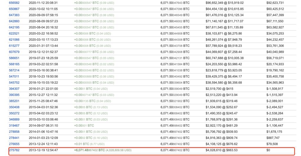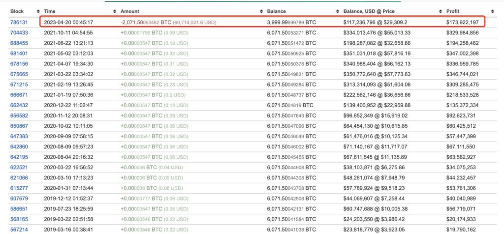 — Whale Alert (@whale_alert) April 24, 2023Wieloryb początkowo kupił 0,2 BTC 7 maja 2011 roku za 1 dolara. Kupił kolejne 100 BTC dwa dni później za 481 USD, a następnie 900 BTC za 4811 USD. Żadne inne transakcje nie zostały zarejestrowane, z wyjątkiem wysyłania niewielkich ilości BTC na adres giganta, prawdopodobnie w wyniku ataków phishingowych typu „dushing”, które próbują utworzyć iluzję powiązania z adresem w celu zaatakowania naiwnych osób.
