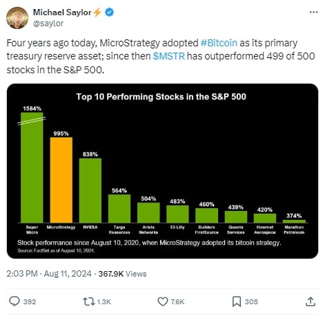 Michael Saylor i jego MicroStrategy po raz pierwszy zakupił Bitcoina 10 sierpnia 2020 roku. Wówczas firma stało się pierwszą spółką notowaną na giełdzie, która przyjęła Bitcoina jako podstawę swoich rezerw. Dziś MicroStrategy posiada już 226 500 Bitcoinów, o wartości około 13,771 mld dolarów. W momencie pisania tekstu Bitcoin kosztuje 60 104 dolary, a średnia cena, po jakiej Saylor kupował kryptowalutę to 37 rys. dolarów. Na ten moment MicroStrategy ma aż 5,39 mld dolarów niezrealizowanych zysków. Firma wciąż realizuje swoją strategię dalszego gromadzenia BTC, a ostatnio zakup dokonała 1 sierpnia. Od momentu zakupu pierwszego zakupu firma Saylora zyskała na giełdzie aż 1000%. To aż 1,5 razy więcej niż zwroty BTC i 16,25 razy więcej niż zwroty z indeksu S&P 500 (SPX) w tym samym okresie.