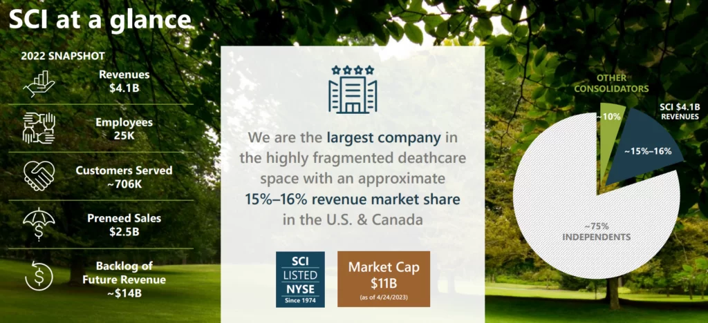 Jest to największa spółka na rynku pogrzebowym w Stanach Zjednoczonych. Działają także na rynku kanadyjskim. W 2022 roku firma wygenerowała przychody na poziomie 4,1 mld$. Co więcej, ma 14 mld$ “zarezerwowane”. Kwota zarezerwowana to płatności od przyszłych klientów, którzy płacą za swój pogrzeb (albo kogoś z rodziny) z wyprzedzeniem.