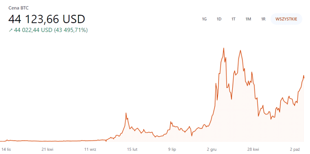 Na chwilę obecną cena Bitcoina wynosi ok. 44 tys. USD za monetę i znajduje się w fazie konsolidacji po ostatnich spadkach i wzrostach.