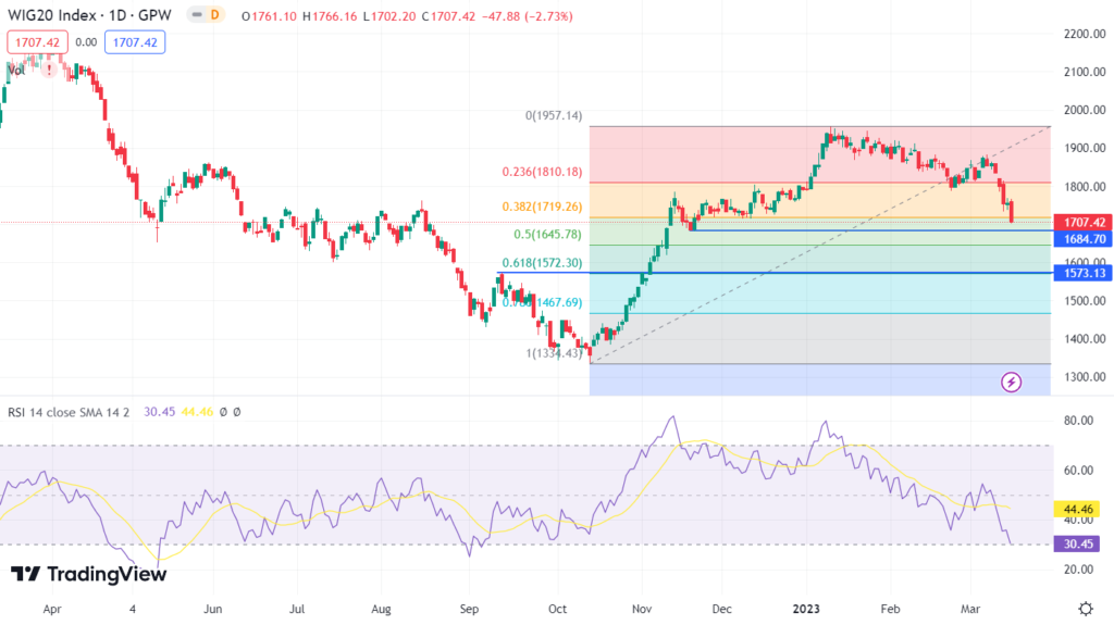 Na wyciągnięcie ręki jest ważne wsparcie jakim jest dołek z 22 listopada 2022 roku (1681 – 1683). W przypadku jego przebicia, niedźwiedzie będą miały otwartą drogę do przetestowania 50% zniesienia fali wzrostowej rozpoczętej w październiku 2022 roku (1645 punkty). Następne istotne wsparcie to okolice szczytu z 13 września 2022 oraz 61,8% zniesienia fali wzrostowej zapoczątkowanej w październiku. Najbliższym punktem obrony dla niedźwiedzi jest szczyt z 14 marca 2023 (1769 punkty).