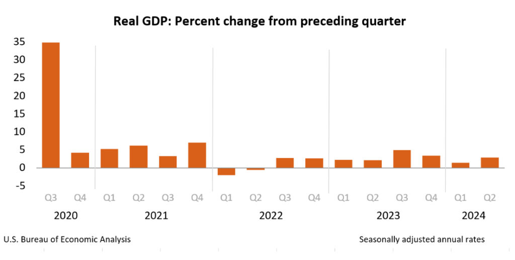 Najważniejszym raportem bieżącego tygodnia były dane PKB z USA, za II kwartał roku. Ku zaskoczeniu inwestorów dane okazały się… Bardzo mocne. Jeszcze bardziej komplikując oczekiwaną zmianę polityki monetarnej Rezerwy Federalnej, która w przyszłym tygodniu podejmie decyzję o stopach procentowych w Stanach Zjednoczonych. Giełdy zareagowały dość niepewnie. Wciąż trwa wyprzedaż w walorach spółek związanych z półprzewodnikami i sztuczną inteligencją.