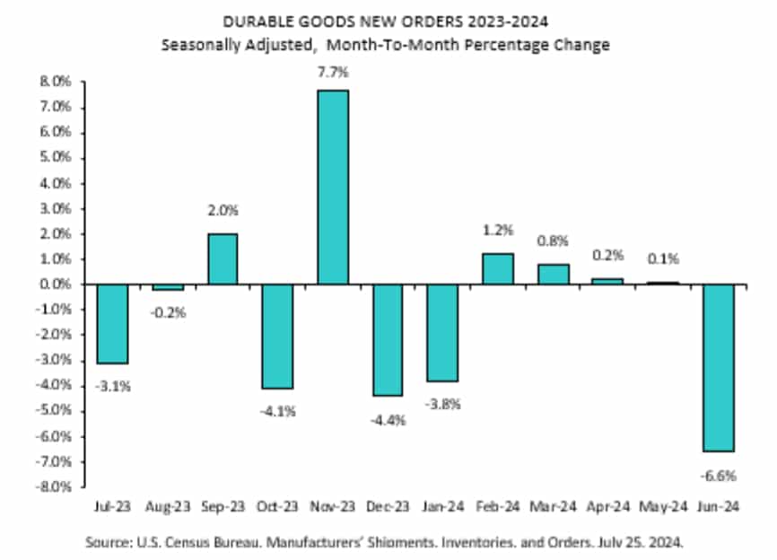 - Zamówienia na dobra trwałe rok do roku spadły o ponad -6,6% rocznie wobec 0,3% oczekiwań i 0,1% w czerwcu